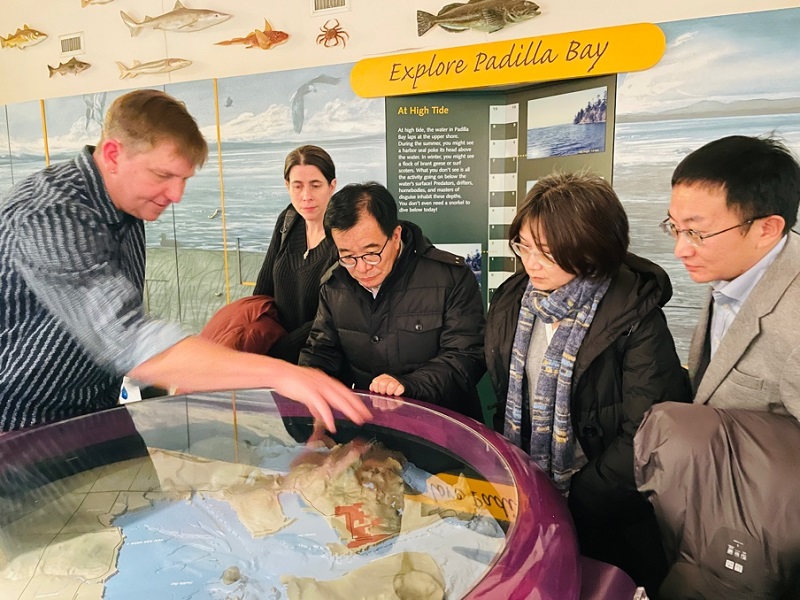 12日下午,王胜一行访问了帕迪拉湾国家河口研究保护区暨太平洋西北地区蓝碳工作组,与保护区主任裘德·阿珀、教育协调员苏珊·伍德围绕海洋环境保护、海岸带生物资源养护和蓝碳相关政策措施进行交流,并参观工作组海洋生物资源养护实验室。