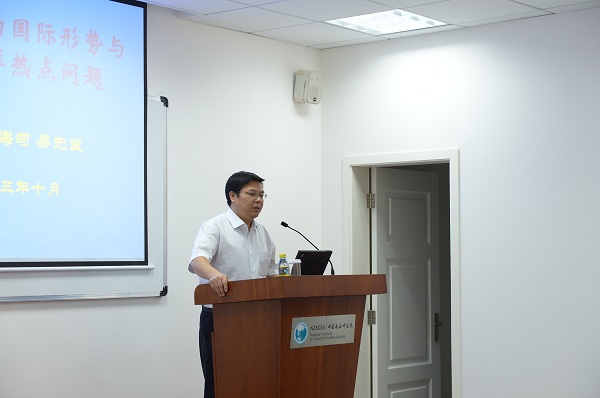 10月23日上午,外交部边界与海洋事务司副司长易先良在我院作题为:“当前外交形势和南海问题”学术报告。 陈儒茂副院长、奚劲松副院长及来自省外事侨务办公室、省海防与口岸办公室、三沙市政府等涉海单位有关人员及我院研究人员听取了报告。