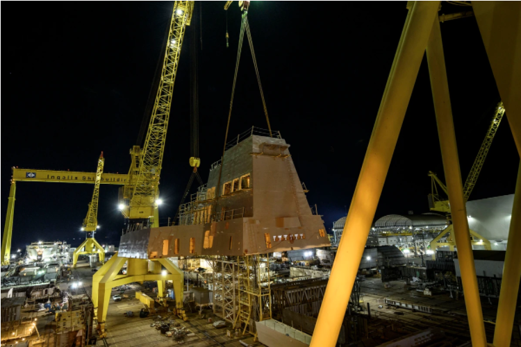 图为英格尔斯造船厂建造的“卢卡斯”号驱逐舰,正在吊装320吨重的舰尾甲板舱