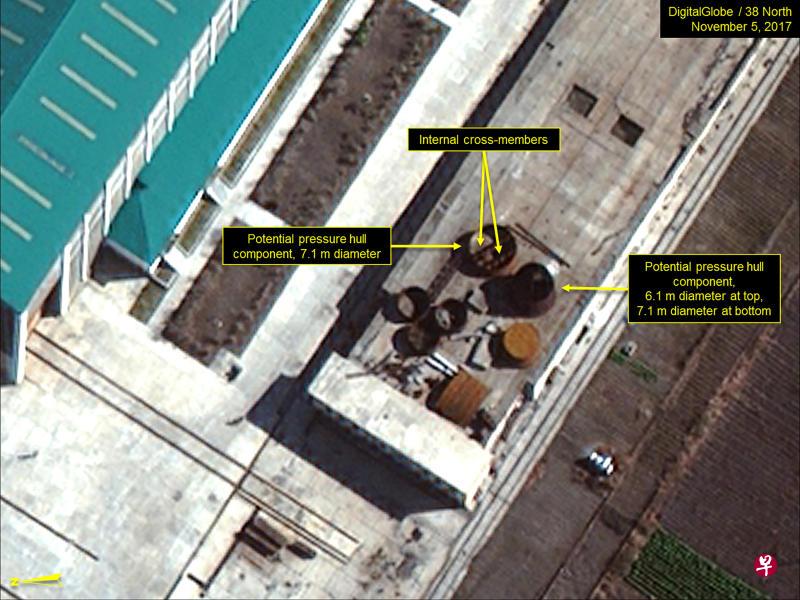 总部在华盛顿、主要研究朝鲜动向的“北纬38度”根据11月5日拍到的朝鲜新浦南造船厂(Sinpo South Shipyard)卫星图像,发布报告说:“造船厂内看到似乎是潜艇承压壳的部分船体,这说明他们正在建造潜艇,也许是新浦级(Sinpo-C)弹道导弹潜艇,即当前新浦级试验弹道导弹潜艇的后续版本。”