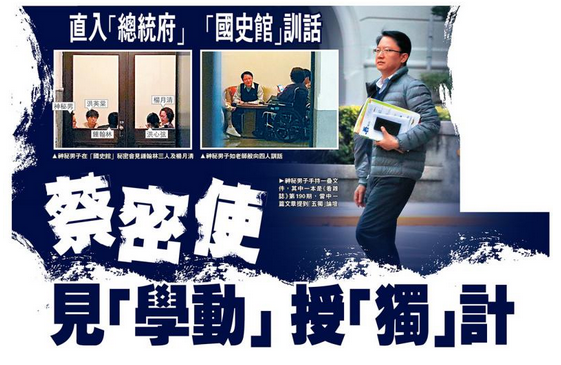 香港《大公报》14日报道称,一名疑似是“蔡英文密使”的“神秘男子”当日在“总统府”旁边的“国史馆”会见了三名“港独”组织成员,以及“台独”团体“台湾青年反共救国团”理事长杨月清。这名“神秘男子”在会面后随即步行到“总统府”,且出入自如,在停车场取车后便扬长而去。
