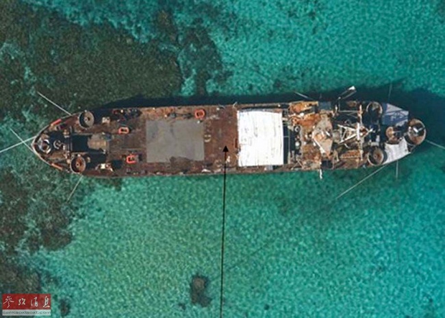 菲律宾在仁爱礁停泊的一艘二战时期旧舰船航拍图。数名菲海军陆战队员一直居住在这条作为“基地”的船上,显示对仁爱礁的控制。